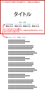 ■2025のルール 【参加の形態】 ①ソロorユニットでの通常参加 自分だけor自前で組んだユニットでの参加 ②ユニットマッチングでのユニット参加 ユニットマッチングに応募し、希望者同士を運営がマッチングしたユニットでの参加 ③私は誰かにこの曲を歌ってほしいのですマッチングでの参加 応募者同士で交換し合ったおすすめの曲を歌って参加 ④自由参加の合唱曲「合戦メドレー」 パート分けに従って1パート歌って参加(ひとり2ブランドまで参加可能) ⑤自由参加の合唱曲「EterniteenAge!!!」 パート分けに従って1パート歌って参加 ①②③の中から2つまで参加できます。④⑤はそれとは別に全員参加できます。 【応募できる曲数】 歌詞カードが自作なら、何曲でも可。 歌詞カードが自作ではない場合は3曲まで。 複数送る場合は、どの曲が流れても悔いのないように! 【合戦当日】 ドラフトで取った曲をキャプテンが交互に選曲しぶつけ合います。 参加した人もしなかった人も、その様子を配信で楽しみましょう。 配信にコメントを書き込むもよし、 Xで #みんマス歌合戦2025 のハッシュタグをつけて感想をツイートするもよしです。 (運営はハッシュタグつきツイートで語られる楽曲制作裏話を楽しみにしています!) 当日に限らず、応援FAXも随時募集しています。 →応援イラストFAXフォーム 【ドラフト】 参加者が歌ったアイマス曲を、紅白のキャプテンが取り合います。 ↑のような、参加者の名前の代わりにアルファベットが割り振られたリストがドラフト直前にキャプテンに渡され、それを「曲ごと」ではなく「人ごと」「ユニットごと」に取り合います。 歌い手には複数曲歌っている人もいれば、1曲に懸けている人もいます。 キャプテンは曲の組み合わせ等から想像を巡らせてドラフトします。手に入れた歌の試し聴きは不可。本番の選曲も勘で挑みます。 なお、ドラフトで使用するリストは配信では公開されません。曲名も口に出さないので、ドラフト配信で得られる情報は両キャプテンの「感情」くらいです。本番で実際に曲が流れるまで、自分が紅組なのか白組なのか分かりません。曲の送り方によっては紅白両方に所属する場合もあります。 【注意とお願い】 ![]() 参加に関する情報を、SNSなど人の目に触れる場で匂わさないことを強く推奨します。 本番での「新鮮さ」を何より大切にしているからです。 すごく仲の良い友人同士でも、情報漏洩は厳禁。 特にご法度なのは「曲名を言う」「ユニット組んだと言う」あたりです。 「やるぞー!」程度のふわっとしたつぶやきはギリギリOK。 「楽しみだ~」などの視聴者視点の話なら大歓迎です。 あと、録音や編集するにあたって有用な情報を、Xで #みんマス歌合戦2025 のハッシュタグをつけてつぶやいていただくのはありがたいです。 誰かに「ユニット組みませんか?」と声をかける際は、DMなど他の人に見られないところでお願いします。 【その他】