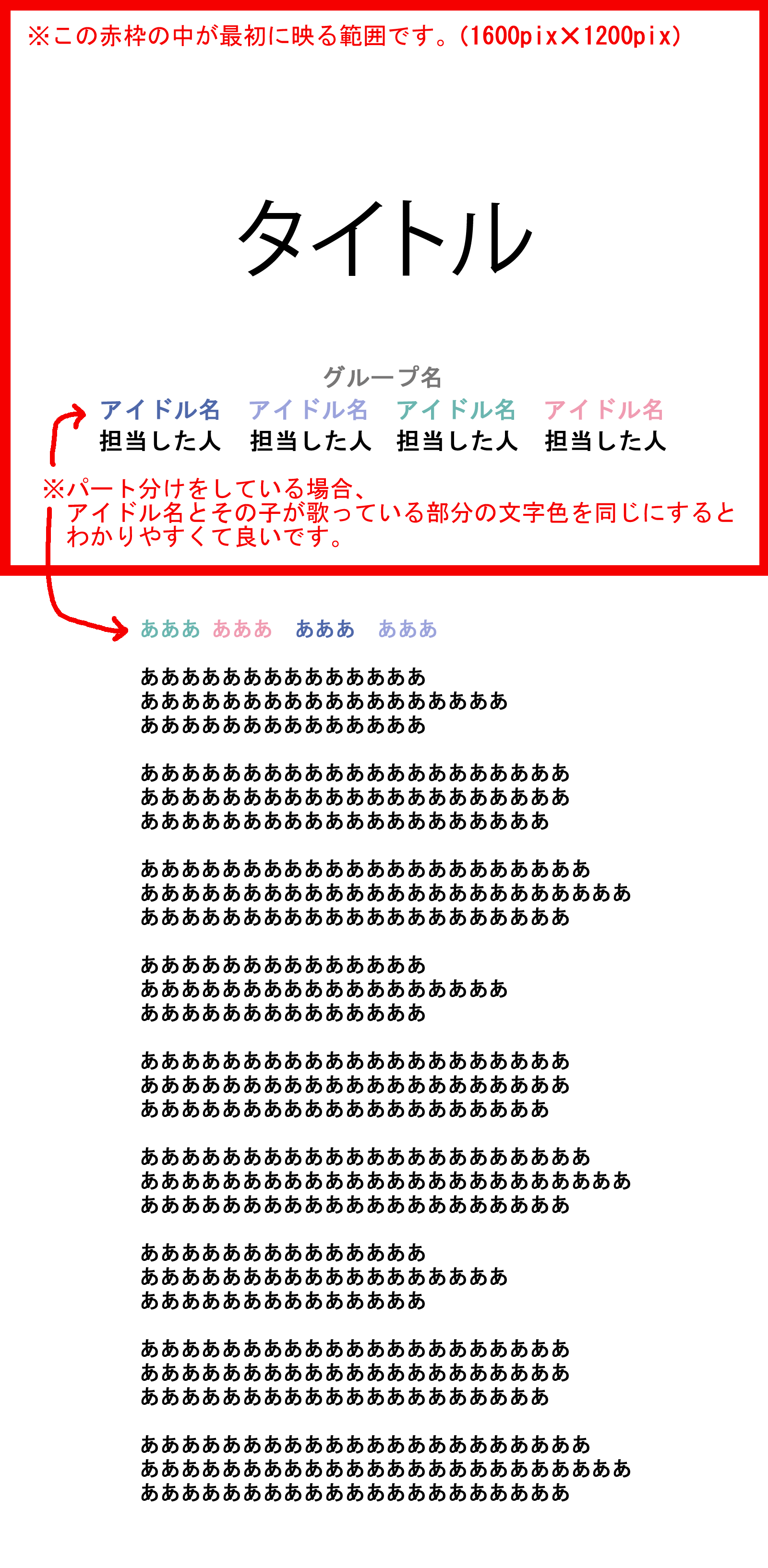 ■楽曲投稿フォーム https://forms.gle/Gh9NcyJZJWzX1utw5 締め切りは12/7! 遅れる場合は必ず専用のフォームで連絡してください→ 投稿遅れますフォーム ソロもユニットもマッチングユニットも私は誰かに(略)マッチングもここから送ってください。 他アーティストのカバー曲の応募は禁止です。 ※合唱曲の応募は別フォームがあります 時間の都合上、コメントは修正・カットする場合があります。 カット部分を補足したい場合は、ハッシュタグつきでツイートしてもらえるとみんなも読めるので最高です。 歌詞画像の投稿もお願いしています。 歌詞画像のサイズは (単位はすべてpixel) 横1600×縦1200の固定式か、 横1600×縦1200以上のスクロール式のどちらかで作ってください。 スクロール式の場合は、最長で縦16000以内におさめてください。 ※公式のキャラクター画像や、フリー素材以外の他人が描いた画像などは使用しないでください ※横スクロール歌詞画像の表示も可能です ※アニメーションGIFなど特殊なことをする場合は、自分でOBSに表示されるか確認をしてから送ってもらえると助かります なるべく自分で作ってもらえると助かりますが、どうしても難しい場合は歌詞を入力する欄があるのでそちらに歌詞を書いてください。改行や区切り方をこだわりたい方向けのGoogleスプレッドシートもありますのでご活用ください。合戦歌詞カード依頼用 ※歌詞画像を自作できない場合は必ず締め切りを守って投稿してください 複数曲応募する場合、その都度投稿せず、一度にまとめて送ってください。 投稿は漏れがないよう慎重にお願いします。 万が一再投稿する場合は、追加・修正分のみを投稿するのではなく、改めて全部まとめて再投稿してください。 歌詞画像サンプル (画像をクリックすると大きいのが開きます) 固定式 ![]() スクロール式 ![]() |